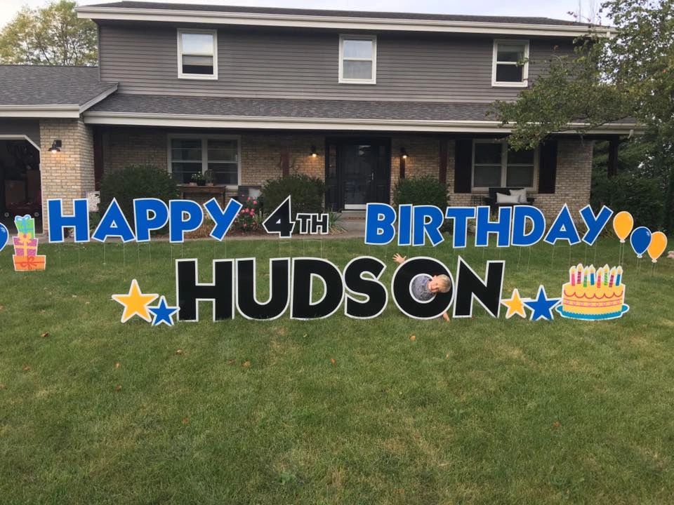 Yard sign rentals for new births birthdays anniversaries graduations retirement invitations proposals cows buzzards skunks The premier lawn greeting company in the Milwaukee area. This package includes the message HAPPY BIRTHDAY along with customized name and age for the recipient.